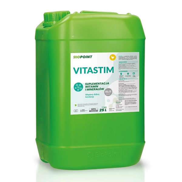 VITASTIM to specjalistyczna mieszanka witamin, aminokwasów, mikroelementów oraz ekstraktów roślinnych, stworzona z myślą o poprawie kondycji i odporności ptaków. Produkt wspomaga regenerację po infekcjach, optymalizuje zdrowie w kluczowych momentach cyklu produkcyjnego oraz wspiera trawienie i funkcjonowanie wątroby.